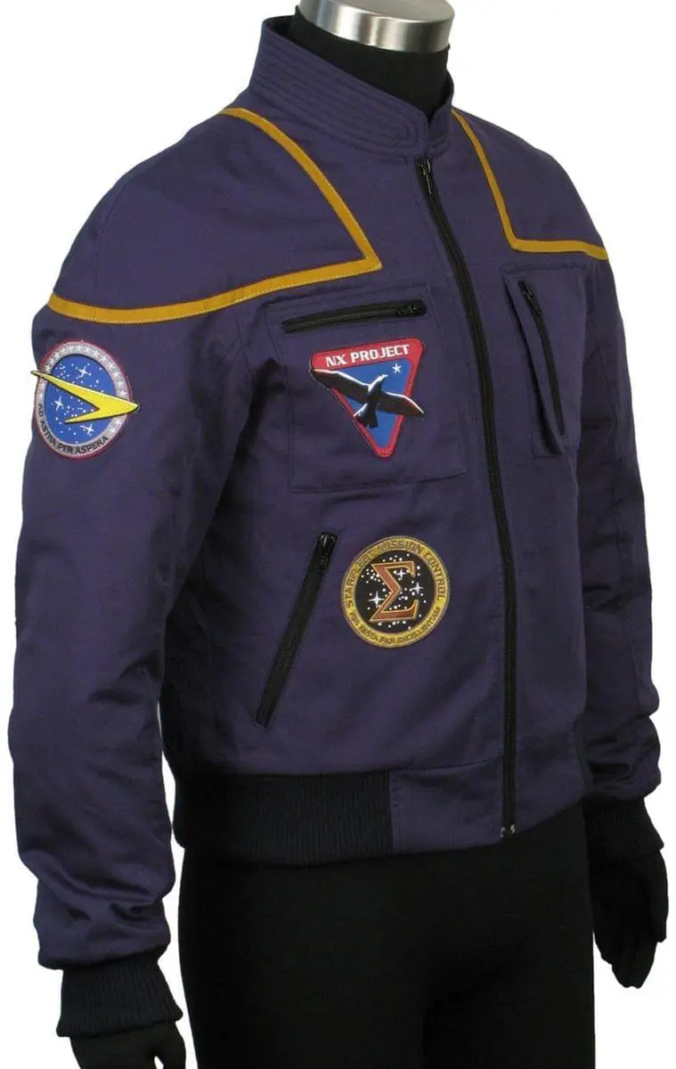 If Jonathan Archer had a flight jacket from his days in the NX Project / Warp 5 Test Program, then this would be it. Designed with the invaluable assistance of Star Trek Art Department’s Mike Okuda and Doug Drexler, and inspired from the Enterprise jumpsuit created by Star Trek Costume Designer Robert Blackman, the jacket features the look and feel of an authentic Starfleet uniform prior to the founding of the United Federation of Planets. Features patches created by Mike Okuda, as well as command division gold striping and unique neck mirroring the look of the Enterprise jumpsuit. Inspired by the Enterprise jumpsuit designed by Star Trek Costume Designer Robert “Bob” Blackman. Constructed from 65% polyester and 35% cotton with 100% polyester inside liner. Fully lined interior for maximal comfort. Patches created using artwork from Mike Okuda, with assistance by Doug Drexler. Command division gold piping as replicated from Enterprise jumpsuit.