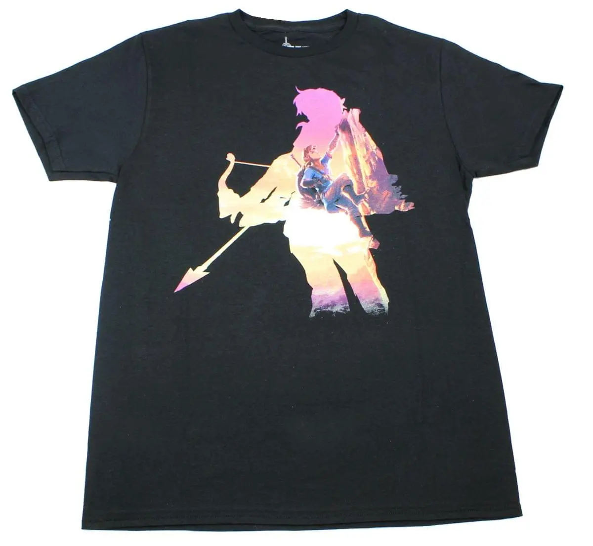 Wear your love of the new Legend of Zelda video game, Breath of the Wild, with this officially licensed tee! Stylish black t-shirt features a silhouette of our hero Link with another image of Link inside showing him scaling a mountain. Comfortable 100% cotton. Men’s sizes. Officially licensed.