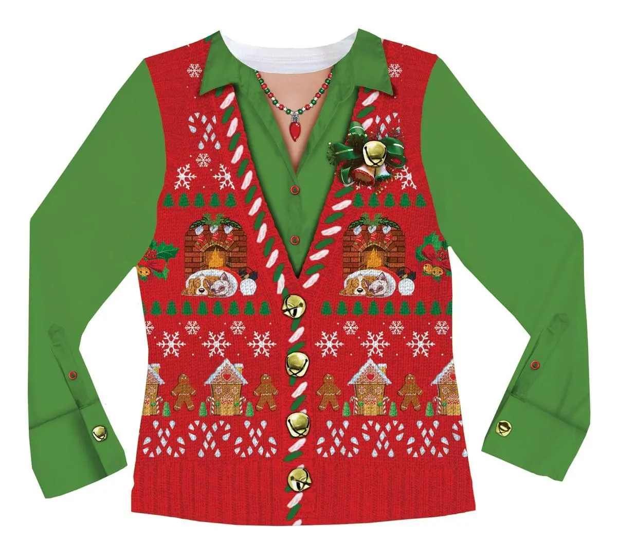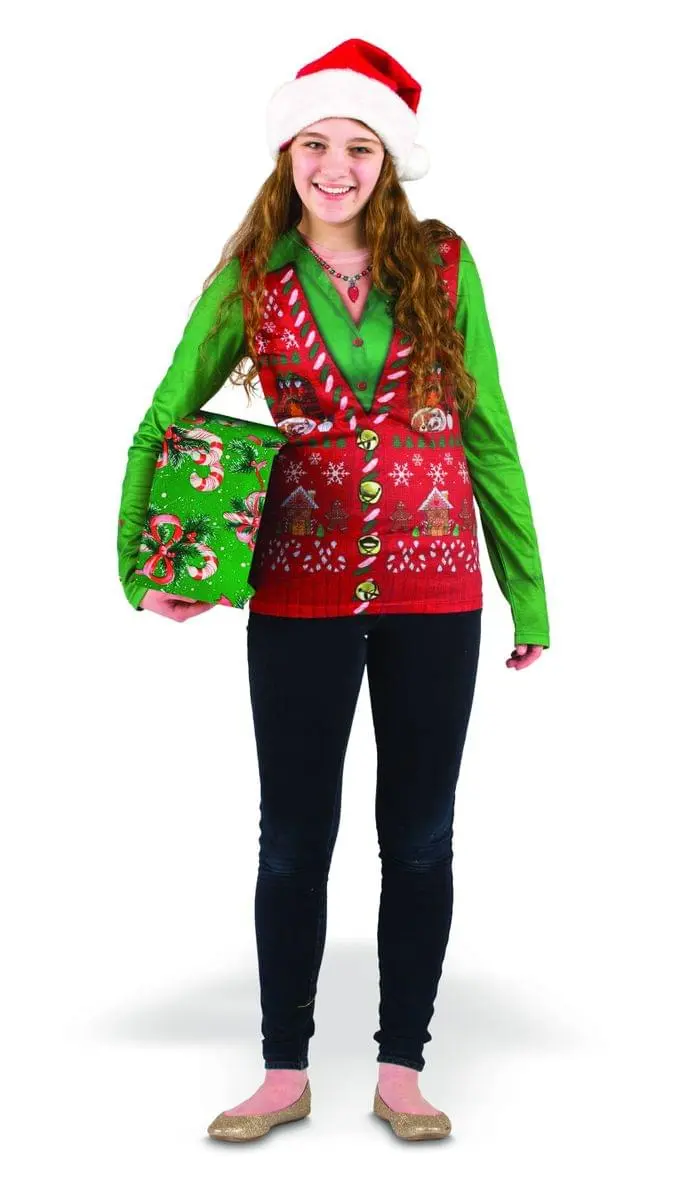 Who needs an itchy Christmas sweater when you can wear a comfy shirt? The Faux Ladies Ugly Christmas Vest Costume T-Shirt is great for holiday parties, family gatherings and more!