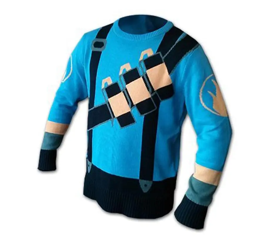 Fire up your holiday sweater party with this officially licensed, blue Team Fortress 2 pyro sweater featuring yellow and black designs and durable material!