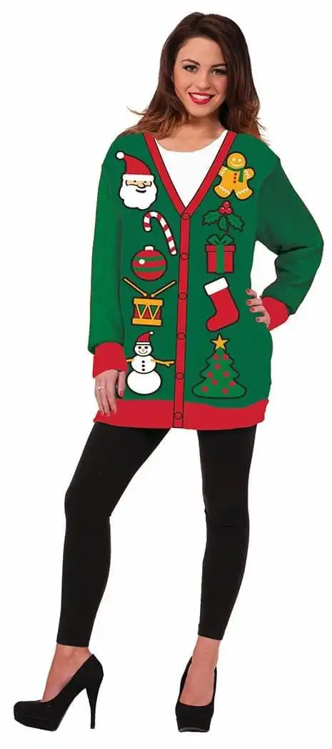 Celebrate Christmas in this ugly, green cardigan sweater featuring comfortable polyester material and images of Santa, a snowman, gingerbread man, candy cane, tree, stocking, and more holiday favorites!