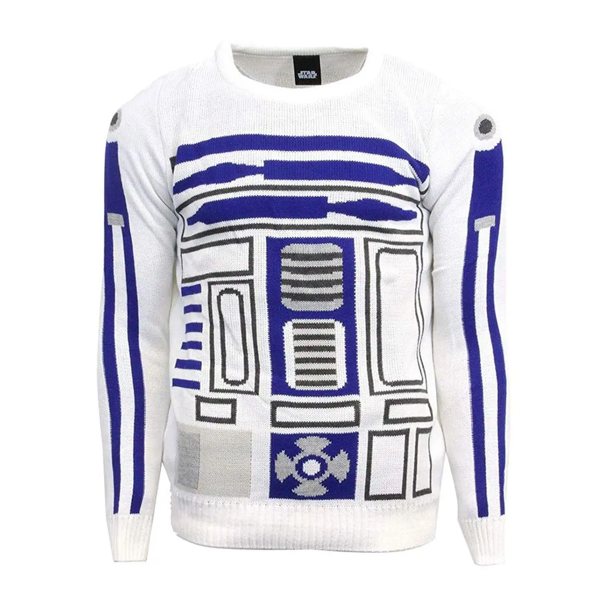 You’ll look cool while keeping warm in this Star Wars R2-D2 Christmas Sweater! White & blue sweater is modeled after the adorable astromech droid. High-quality 100% knitted sweater features a crew neckline with ribbed trim. Adult sizes. Officially licensed. Makes a great gift for any Star Wars fan!