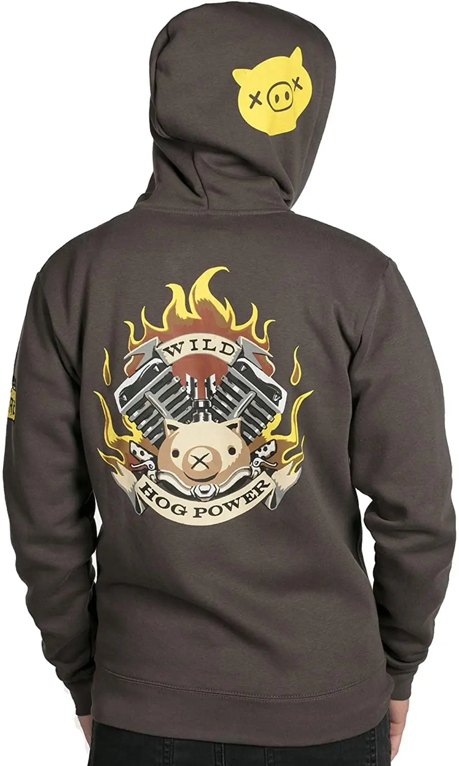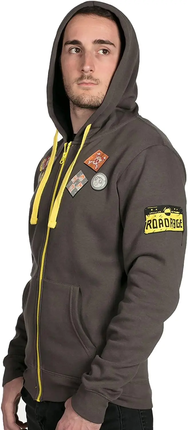 I’m a one-man apocalypse! Throw out your hook and grab this hoodie featuring a biker-style design on super-soft material. Let your opponent’s know you can tank whatever they can throw at you and they’ll get a present in return: a Scrap Gun blast. Time to go Whole Hog! Featuring Roadhog, a bodyguard hero from Overwatch video game. Gray hoodie with yellow accents, featuring Roadhog’s Hog Power tattoo on the back, tons of patches on the front and hoodie, his ROADR8GE buckle on the left sleeve, and even an Overwatch custom patch on the hem. Custom zip-up hoodie jacket, knitted from 65% cotton, 35% polyester; Heavyweight 7.2 ounce fleece. Machine wash in cold with like colors; tumble dry on low; do not bleach; iron low if needed, do not iron on graphic. Officially licensed by Overwatch; designed and created by J!NX.