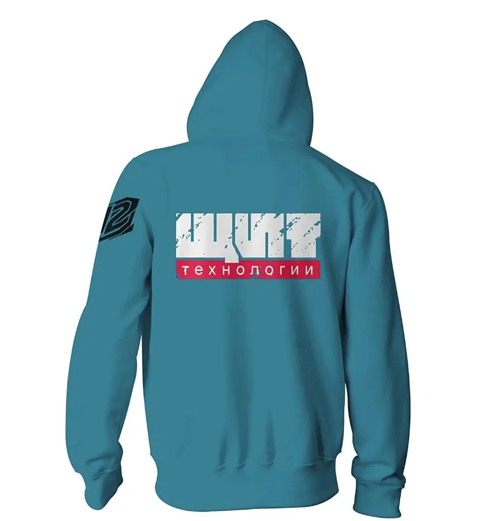 Together we are strong. Using particles and gravity, Aleksandra Zaryanova has become a force to be reckoned with. Your comrades will know they’re safe when you show up. Your opponents will find themselves trapped in a Graviton Surge. Featuring Zarya, a weightlifting hero from Overwatch video game. Blue hoodie with pink accents, featuring Zarya’s pink hair on the front, her Shield Technologies emblem on the back, 512 tattoo on the left sleeve, and even an Overwatch custom patch on the hem. Custom zip-up hoodie jacket, knitted from 65% cotton, 35% polyester; Heavyweight 7.2 ounce fleece.
