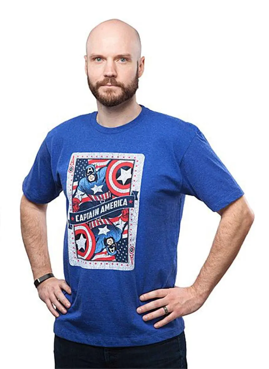 “A” is for Avengers… and Awesome! This heather blue tee features a distressed print of Captain America as the Ace of Stars on the front. Cotton/Polyester blend