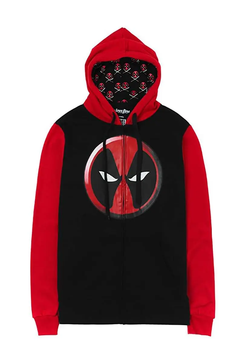 You’ll be in charge when you wear this cool Marvel Deadpool hoodie featuring the iconic logo of the Merc with a Mouth! The Marvel Deadpool hoodie is black with a red and white Deadpool logo on the front. The hoodie features a drawstring closure and full length zipper up the chest. Wearing it will fill you with an insatiable need to break the 4th wall, eat Mexican food, and torment people named ‘Bob’.