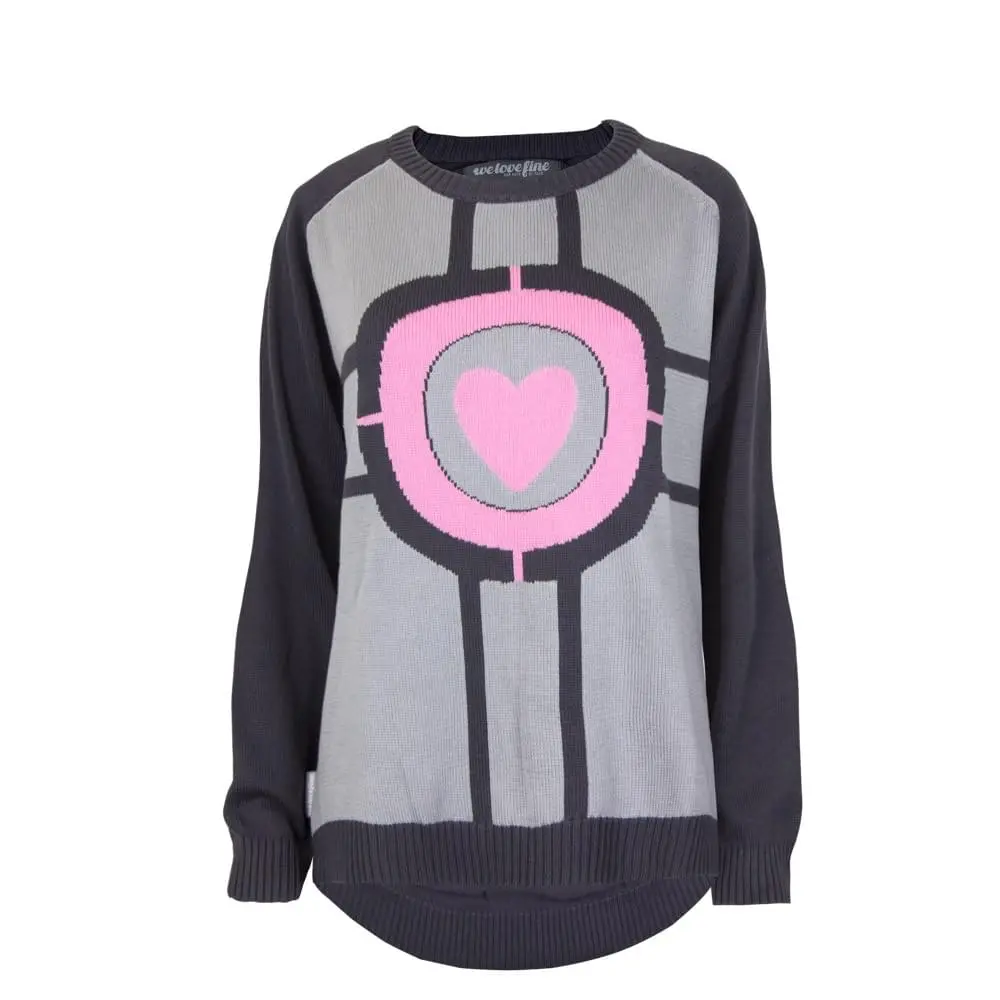Now you can take your Companion Cube with you wherever you go! From the smash hit video game Portal, this officially licensed long sleeve crew neck hi-lo sweater is sure to keep you toasty warm and looking stylish in the toughest of situations. The sweater features an image of the iconic Companion Cube on the front with knitted hearts at the elbows. This is a loose fit sweater with a lower scoop hem in the back.