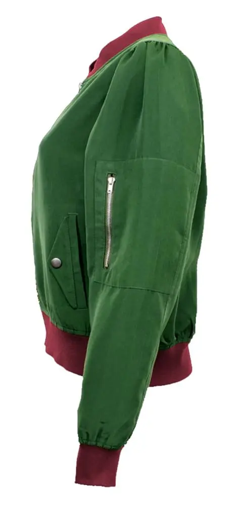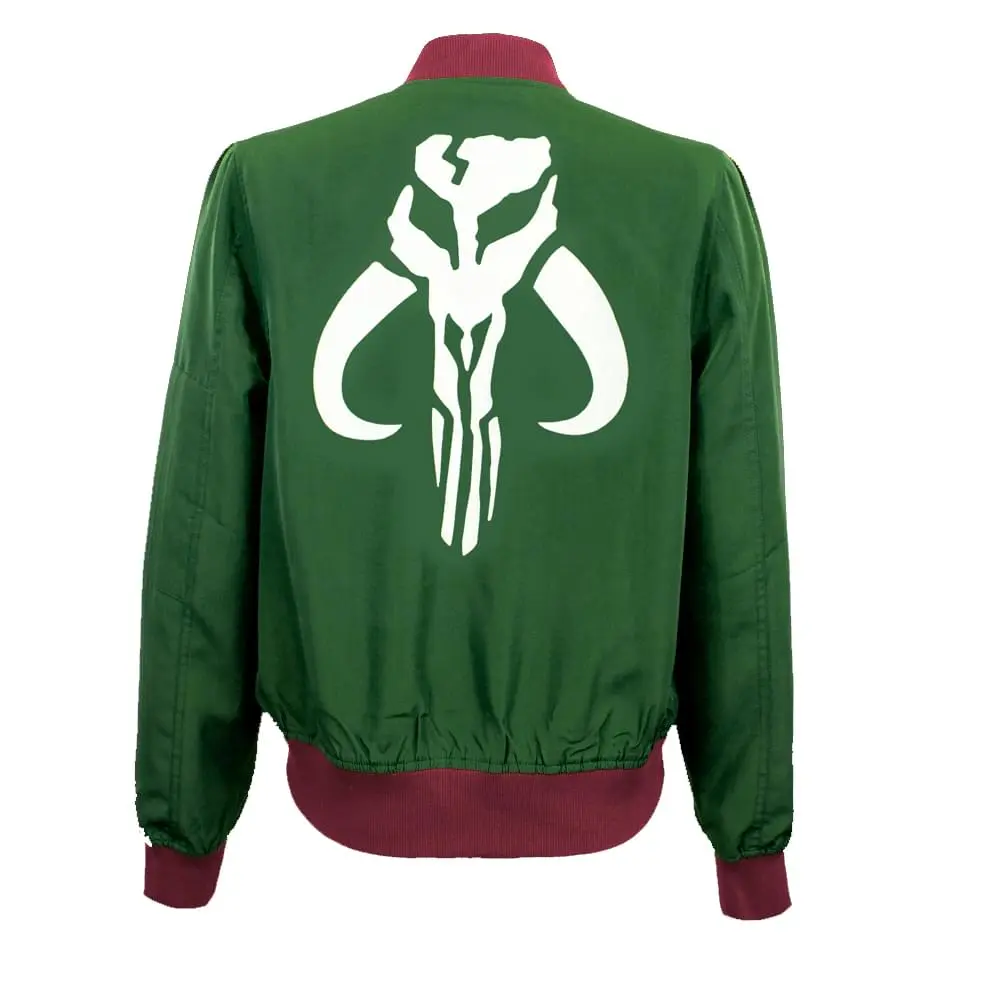 Bounty Hunters unite with this olive green bomber jacket! It features contrasting burgundy ribbing at the neck, sleeves and bottom band. It has a zip front, side pockets, arm pocket with zipper on the sleeve, patch front art, and a dramatic screen print on the back.