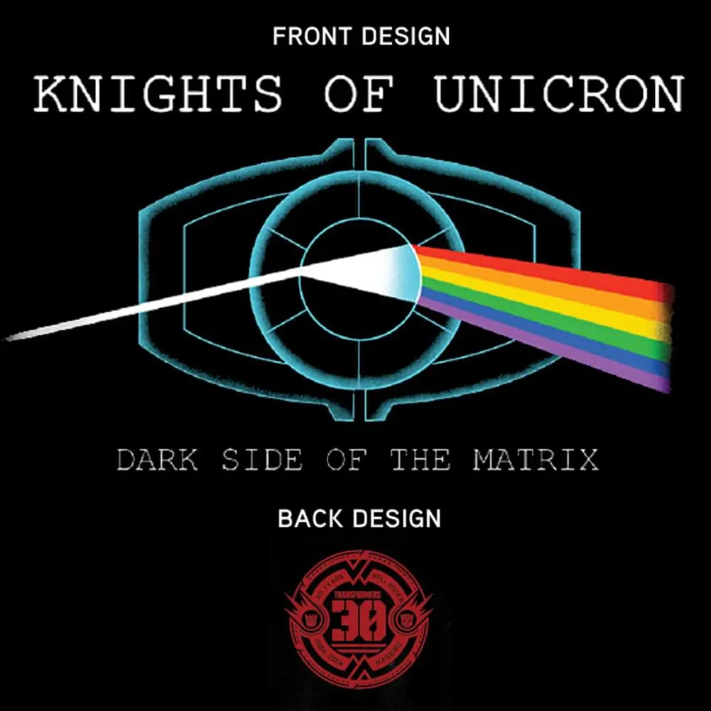 This awesome Transformers shirt celebrates Cybertron’s most legendary bot ‘n roll band, the Knights of Unicron! This black 100% cotton shirt displays the album art for “Dark Side of the Matrix”, a play on Pink Floyd’s legendary record, Dark Side of the Moon. Machine wash cold.
