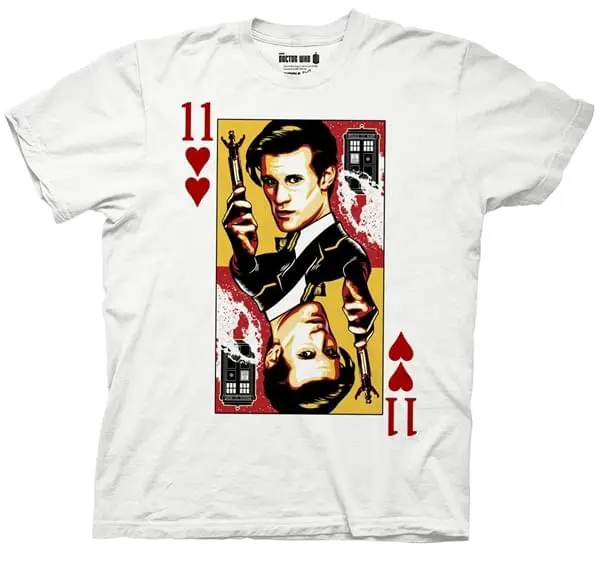 Holding a heavy hand with eleven of double hearts? You risk the chance of having them broken twice hard! No twice destroyed Time Lord hearts here when you wear the Doctor Who Playing Cards Adult Premium T-Shirt.