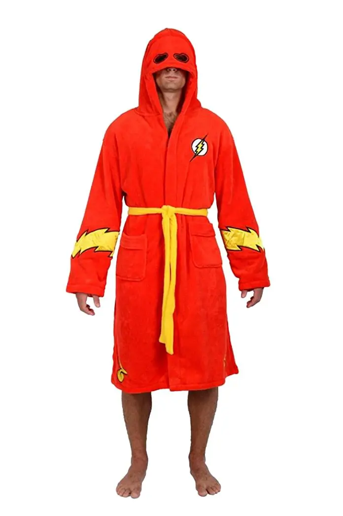 Pretend that you are DC Comics’ famed Speedster while wearing this officially licensed Flash Hooded Robe! Comfy polyester fleece robe resembles the Flash’s brilliant red superhero costume, accented with a yellow belt and embroidered yellow lightening bolt cuffs and chest logo. A hood with eye holes completes the costumed look. Robe also features two front pockets. One size fits most (adults).