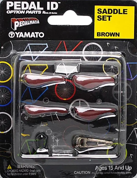 Customize your wheels! This Pedal ID Set allows you to customize your 1:9 scale model bicycle in a style that’s uniquely you and one of a kind. Mix and match components! This set includes x4 different brown saddle seats. PVC/ABS plastic construction. Blister card packaging.
