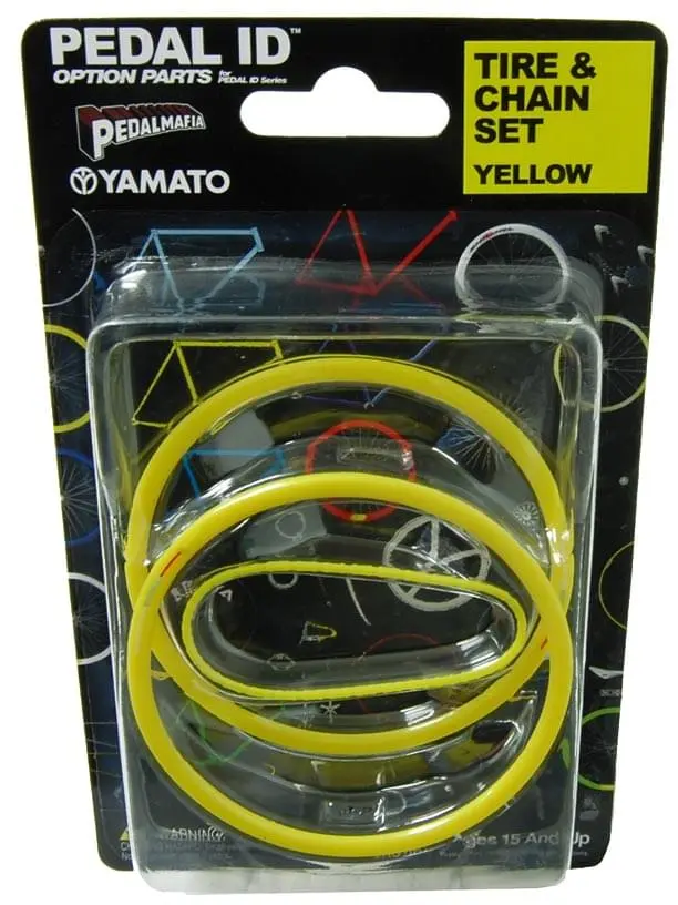 Customize your wheels! This Pedal ID Set allows you to customize your 1:9 scale model bicycle in a style that’s uniquely you and one of a kind. Mix and match components! This set includes 2x tires and 1x chain in yellow. PVC/ABS plastic construction. Blister card packaging.